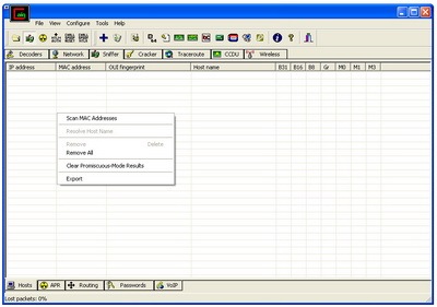 - Next, klik tab Sniffer (yang atas), klik kanan di tengah field kosong, pilih Scan MAC Addresses